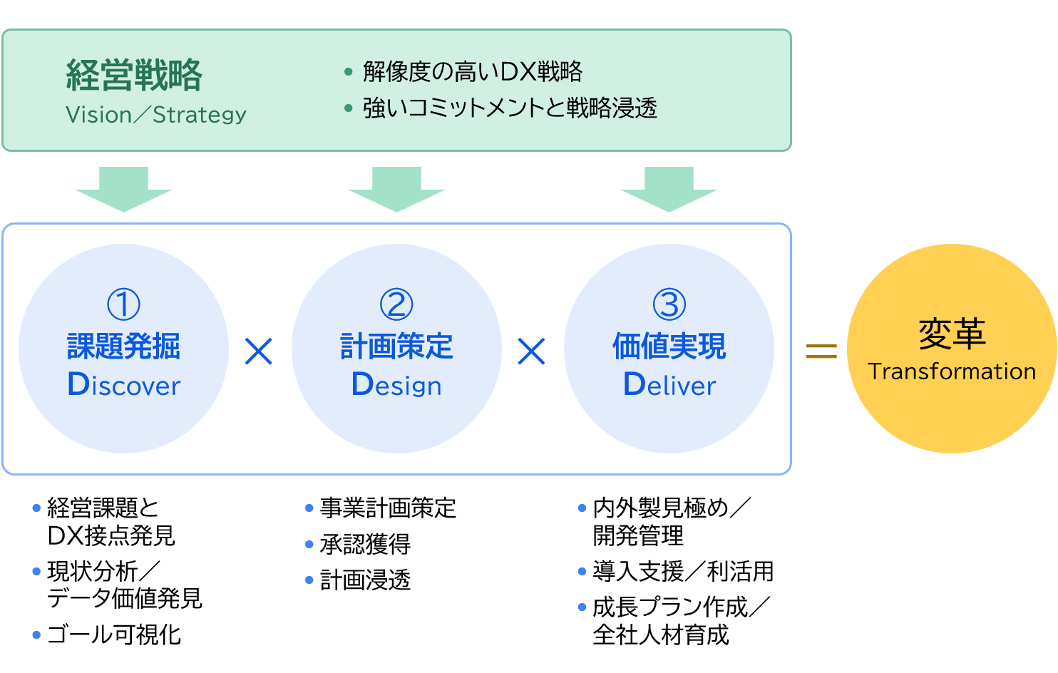 このような理解の上で、改めてキータスクを見ると、「3つのD(Discover・Design・Deliver)」は変革を駆動するエンジンに見えてこないだろうか。DXはその名の通りデジタル技術による変革である。デジタル技術の理解や活用力は変革を加速させ、失敗確率を低下させる不可欠な要素である。しかし先駆者たちの経験・主張を踏まえると、より本質的に求められているものは、組織で新しいコトを興すための3つのDであったことを最後に強調したい。