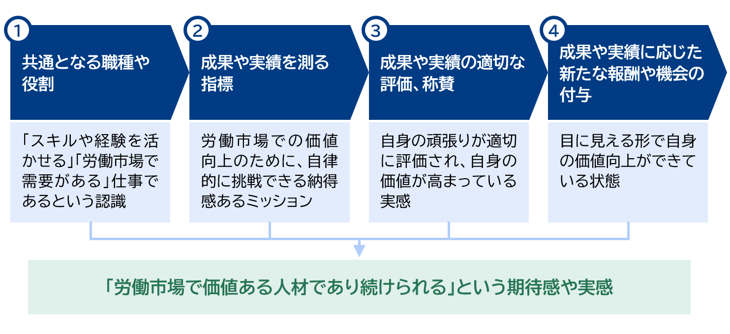 そもそも、「流動的な労働市場において人材を惹きつけ、とどめる」ためにはどのような要素が必要であろうか。筆者は、①労働市場で共通となる職種や役割、②成果を測る指標、③成果の評価、④成果に応じた新たな報酬や機会、役割の付与、の4点がバランスよく組み合わさっていることが重要と考える。例えば営業職としてキャリアを積みたい人材にとっては、営業職のポジションが存在し(①)、求められている成果が数値化されており(②)、その成果を適切に評価・称賛され(③)、報酬や昇進に直結すること(④)が「魅力ある営業ポジション」の条件と言えるだろう。逆にそれらが不十分だと、優秀な人材ほど営業職として市場価値をより高められる外部の機会を求めて転職していってしまう。