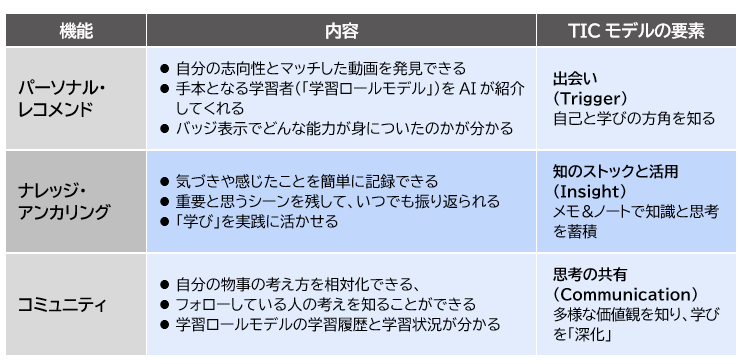 パーソナル・レコメンドでは、オンライン学習を開始するきっかけを提供するほか、次に学ぶべきコンテンツの発見を後押しする。ナレッジ・アンカリングでは、断片的な知識を構造化し、知恵や見識に高めるよう促すための仕掛けが、学習内容の理解と定着を深める効果を持つ。コミュニティでは、他者とともに学ぶ環境を創出することにより、オンライン学習の継続性を高め、習慣化を促す効果が期待される。これら3つの機能を組み合わせ、「新たな学習サービスの体験」としてユーザーに提供することにより、オンライン学習が持つ「継続」と「定着」の2つの課題の解消と、それによる効率的かつ効果的なリスキリングの実現を図る。