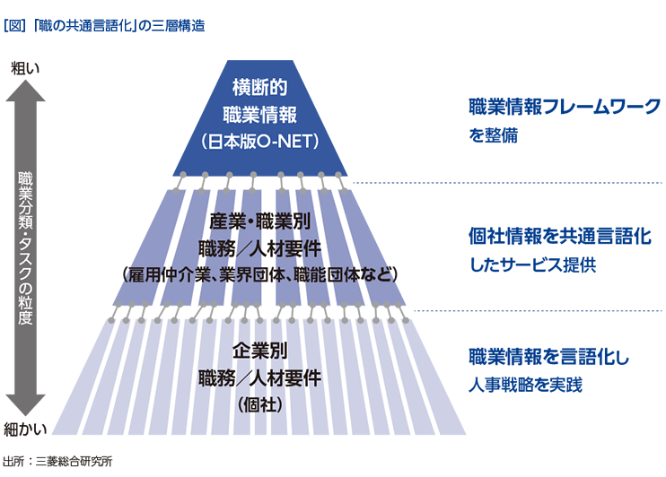 まずは職業情報の言語化が前提となる。いわゆる「ジョブ・ディスクリプション(職務記述書)」の明確化に相当する。人材流動化に対応しやすい「ジョブ型雇用制度」、人材の能力を一元管理する「タレントマネジメント」を重視する動きも職業情報の言語化を促す。これらは個別企業単位でスキルやタスクを言語化する試みといえる。