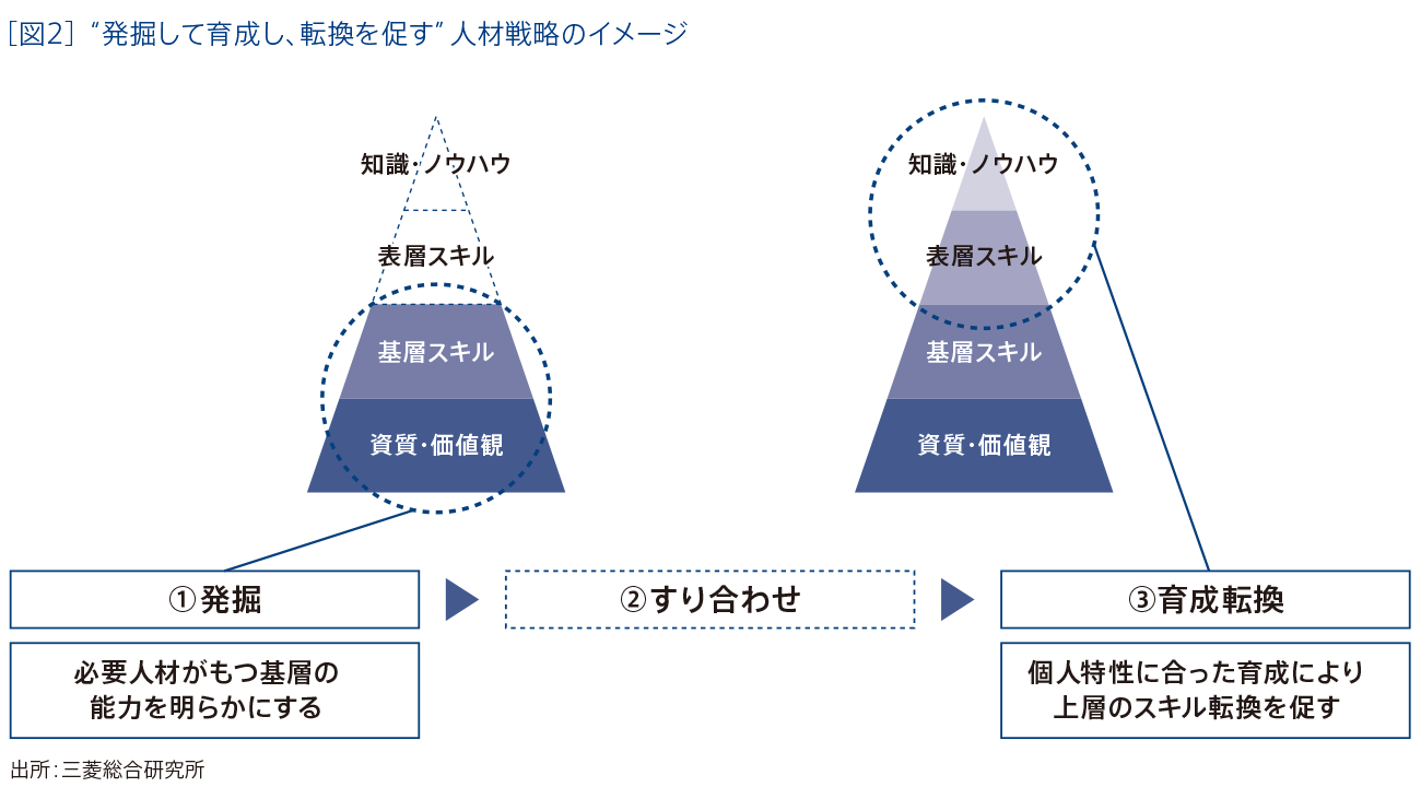 今後必要とされる人材は不足していくという前提なので、表層の能力に着目しても人材は確保できない。そこで、まず企業として育成したい人材像をいくつか定め、これらの人材像がもっていると思われる基層の能力、すなわち「資質・価値観」や「基層スキル」を明確化する。その上で、該当する基層の能力を有する人材を発掘した上で育成によって表層の能力を身につけてもらい、転換を図るのがよいだろう※4。