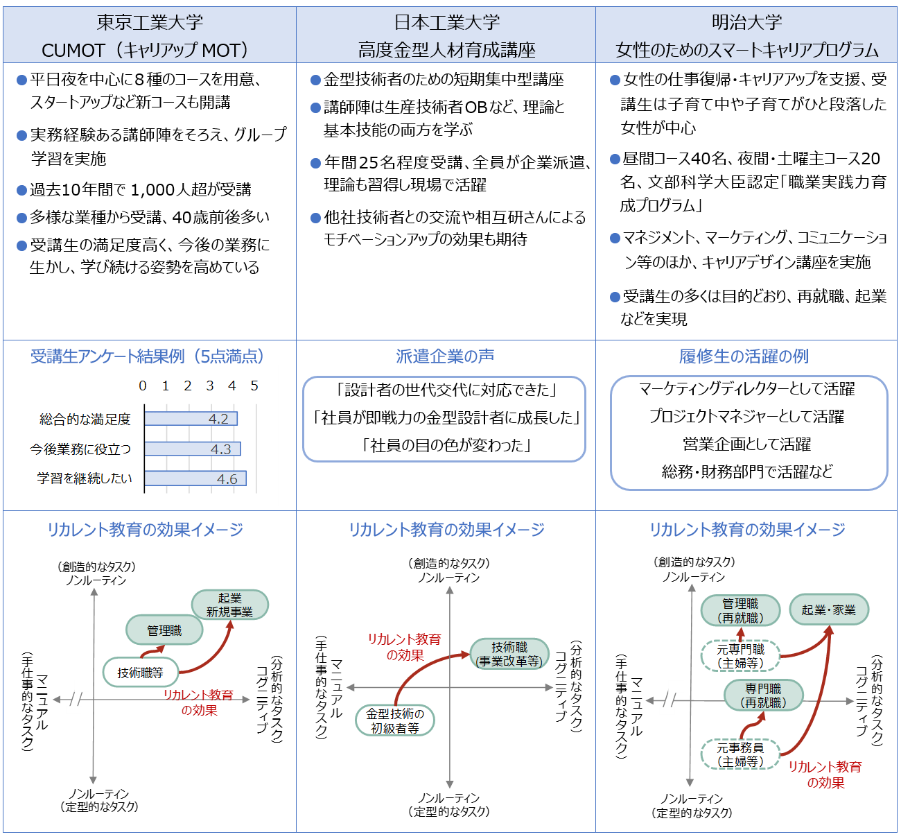 これら3つの事例は、技術職、管理職、研究職、金型技術の初級者、女性と対象が異なり、学習する専門的スキルはさまざまであるが、共通点として、実践型の講師陣をそろえ、受講生によるグループワークを重視している。その結果、受講者は、実践的な刺激により学び続ける姿勢を身に着け、多様な受講生との協働により管理・コミュニケーション力を培うことで、より創造的・分析的な仕事へのキャリアアップを実現している。