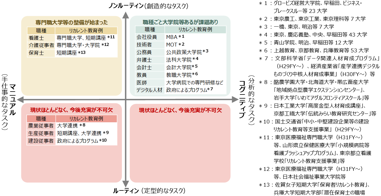 日本の現状をみると、管理者向けMBAや技術者向けMOTなどは既にあるが(図表9-2の右上象限)、教育の内容や効果は欧米に比べると十分とは言い難い※3。これ以外の職種については、人材が不足する介護分野など(同左上象限)は政府による整備がようやく始まったところであり、事務職、販売・サービス職(同右下象限)、生産・運輸・建設職(同左下象限)向けのリカレント教育はほとんど提供されていない。