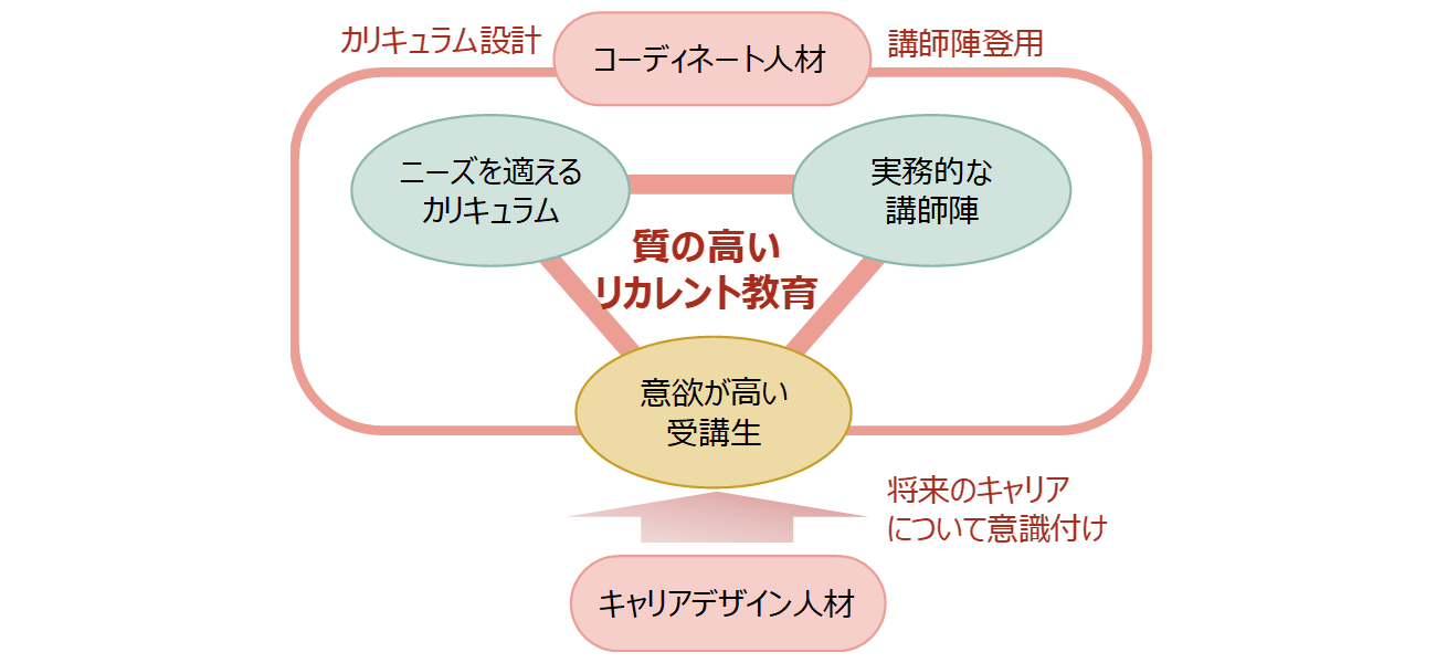 コーディネート人材は、リカレント教育機関において、カリキュラムの設計、講師陣の登用のほか、受講生の募集、事業採算性の確保などの事業経営を担う。リカレント教育の質が確保できるかどうかは、コーディネート人材の能力に負うところが大きい。類似の例として、政府が進めてきた産学官連携においても、コーディネーターの重要性が認識され、研究開発をマネジメントするリサーチ・アドミニストレーターが育成されてきた。