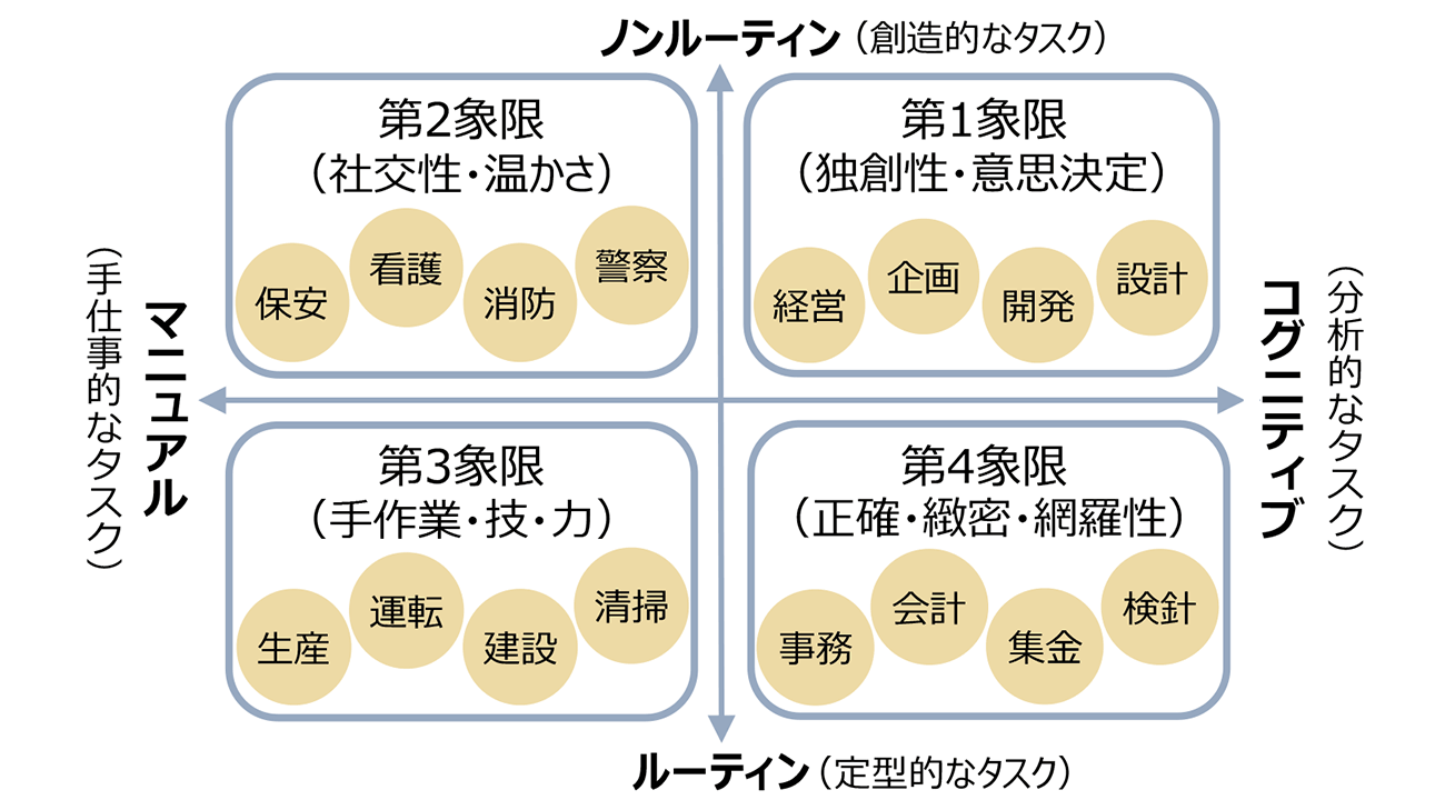 「タスクモデル」の考え方と米国O*NETの職業特性データに基づいて、日本の人材ポートフォリオを2軸・4象限上に映し出した。この結果、日本の人材の多くがルーティンタスクの領域に集中していることが示された。