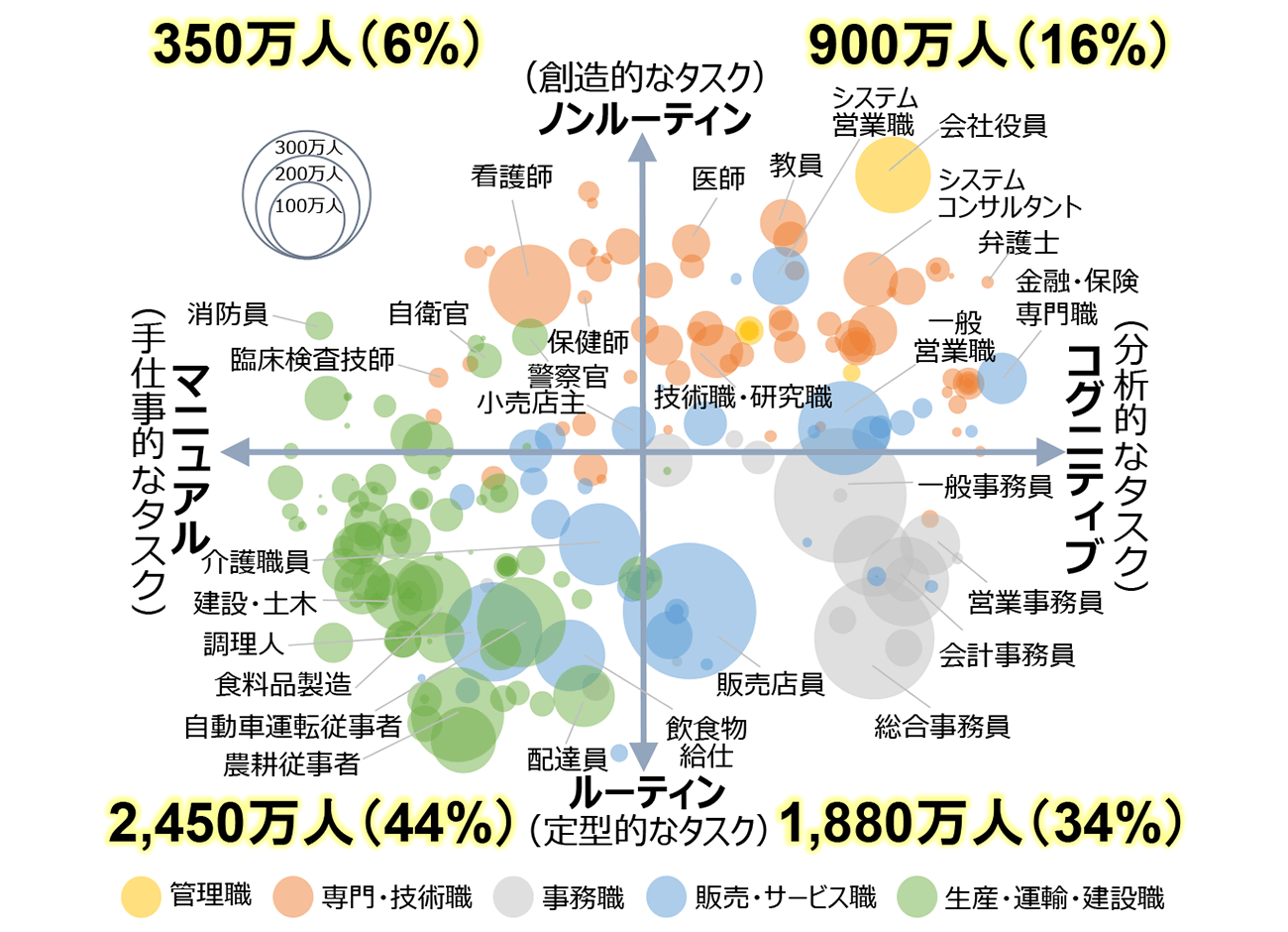 また、図中に表示しているとおり、各象限に属する就業者数には偏りがある。第1象限(ノンルーティン・コグニティブ領域)には900万人(全体の16%)、第2象限(ノンルーティン・マニュアル領域)には350万人(同6%)、第3象限(ルーティン・マニュアル領域)には2,450万人(同44%)、第4象限(ルーティン・コグニティブ領域)には1,880万人(同34%)となっており、第3象限は第2象限の7倍に上る就業者を抱えている。