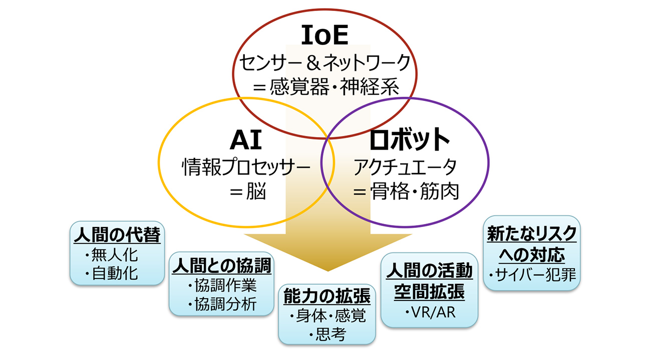 第四次産業革命では、さまざまな要素技術が、集合として破壊的なイノベーションをもたらす。中でも中核的な構成要素となるのが「AI(Artificial Intelligence)」「ロボット」「IoE(Internet of Everything)」という三つの新技術だ(図表1-1)※2 。人間に例えれば脳、骨格・筋肉、感覚器・神経系に相当するこれらの技術は、相互に連携しつつ、あたかも地球を覆う新たな巨大生命体かのごとく自ら考え、自ら最適化する。2030年に向けた10数年は、これら三つのコア技術が生活の場に適用され普及していく過渡期にあたる。この間、定型的な事務作業はもちろん、ロボット・IoEとAIの融合が進展するとともに、物理的な作業やコミュニケーションが必要な作業に至るまで、徐々に機械への代替が進むことが見込まれる。
