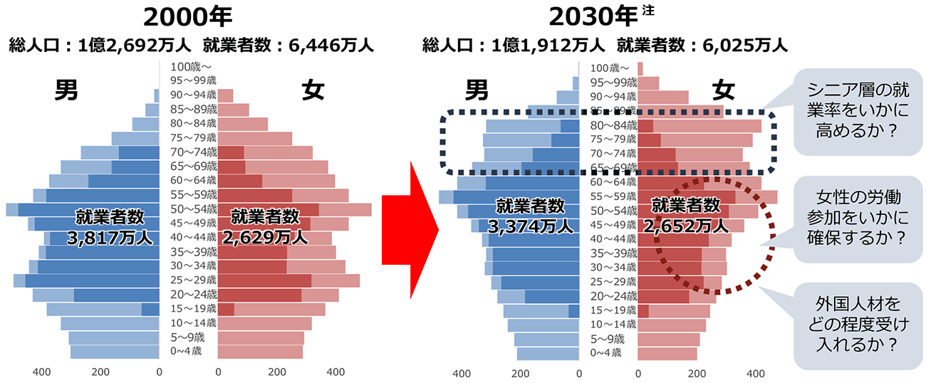 人口減少トレンドがもはや不可避となった今、私たちは行いうるすべての対策を講じて人材を確保しなければならない。2000年と2030年の人口ピラミッドを示す図表1-2を見るとおり、今後の生産年齢人口が先細るのは明らかだ。日本の経済規模を維持拡大するには、人口のボリュームゾーンとなるシニア層の就業率向上、いまだ十分に活用できていない女性の労働参加確保、より幅広い分野での外国人材受け入れのいずれか、もしくはすべてを推進する必要がある。先に述べた技術革新による生産性向上が必要な労働力を徐々に縮減していくものの、労働代替のペースと人口減少のペースには相応のミスマッチが伴う(このミスマッチについては第2回に詳述する)。