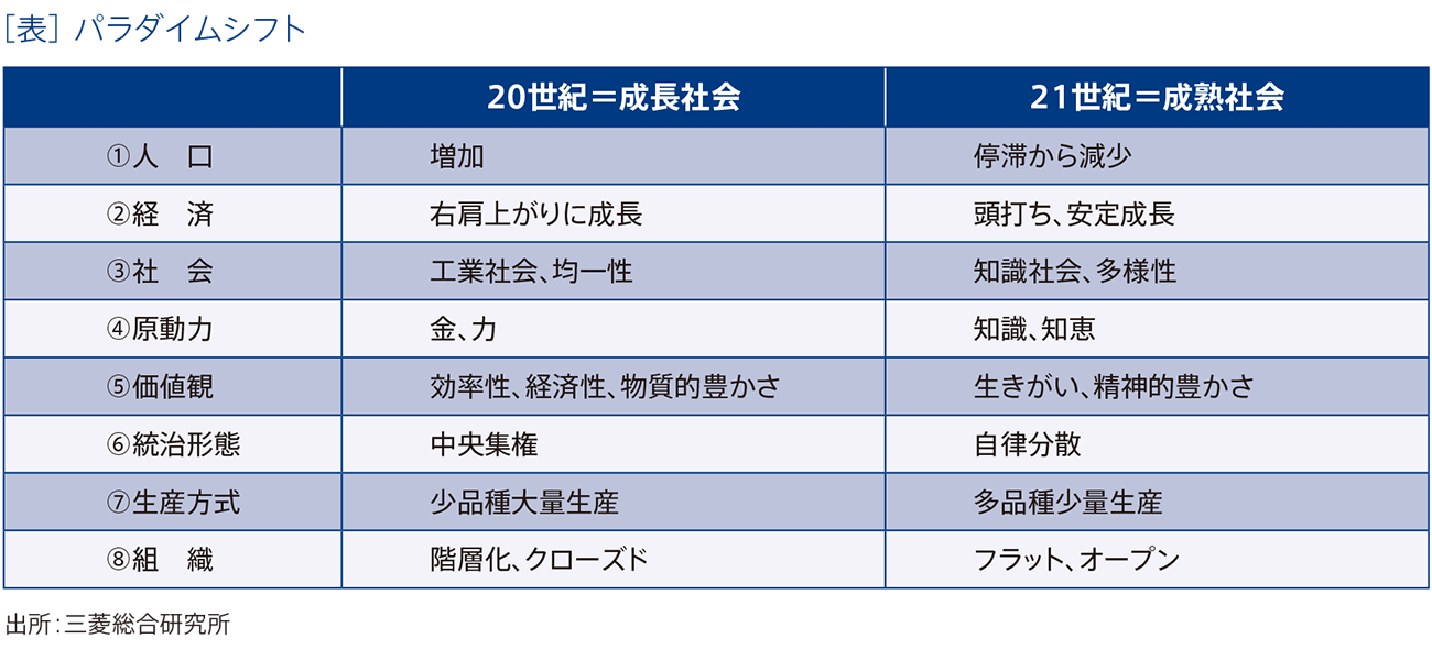 20世紀は工業生産の拡大が経済成長をけん引し、先進国を中心に経済性と効率性が重視された時代であった。日本は物質的な豊かさを求めて、工業を駆動力とする量的成長を図り、人口増加を追い風とした生産・消費の高度成長で世界第2位の経済大国に駆け上がった。政府・財政主導で産業政策と社会資本整備が進められ、個人は良き組織人・会社人間として、個性よりも協調性が求められた。