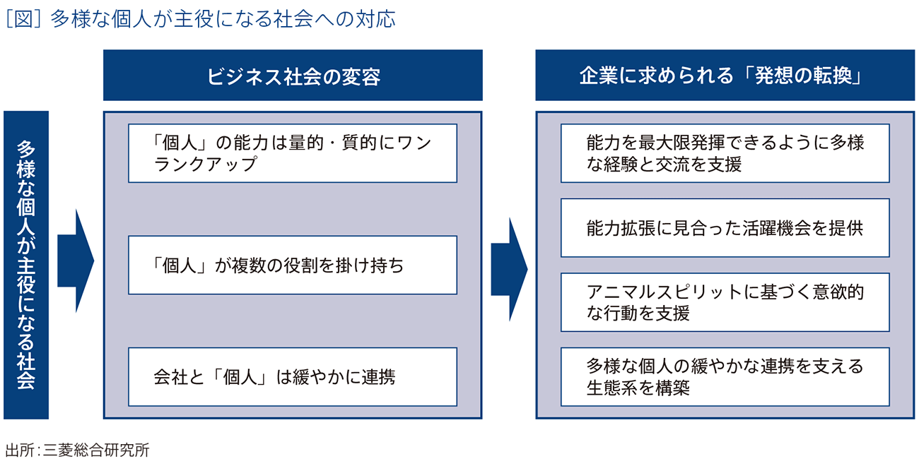 これまでは、会社が雇用という形式で個人の生活をサポートするのが一般的であり、個人はその代わり会社に属して、会社の目標達成に貢献することが求められた。技術革新により、時間的にも空間的にも自由度が高まったことを背景に、在宅勤務やリモートワークが普及するなど、働き方の柔軟性が広がりつつある。仕事の選択可能性の拡大と相まって、個人が会社に頼らない働き方も広がっていく。実際、会社との雇用契約に基づく従属的な立場を脱し、兼業や副業をする個人は増加している。こうした動きにいち早く対応して、ロート製薬の「社内ダブルジョブ制度」や、自由に他部署の仕事を担うことのできるカルビーの「仕事チャレンジ制度」など、社員の動きを一つの業務や役割に限定せず、社内他部署の仕事を自由に行える仕組みが導入されている。コニカミノルタやソフトバンク、DeNA、グロービスなど、副業を解禁ないし推奨し始めている企業もある。