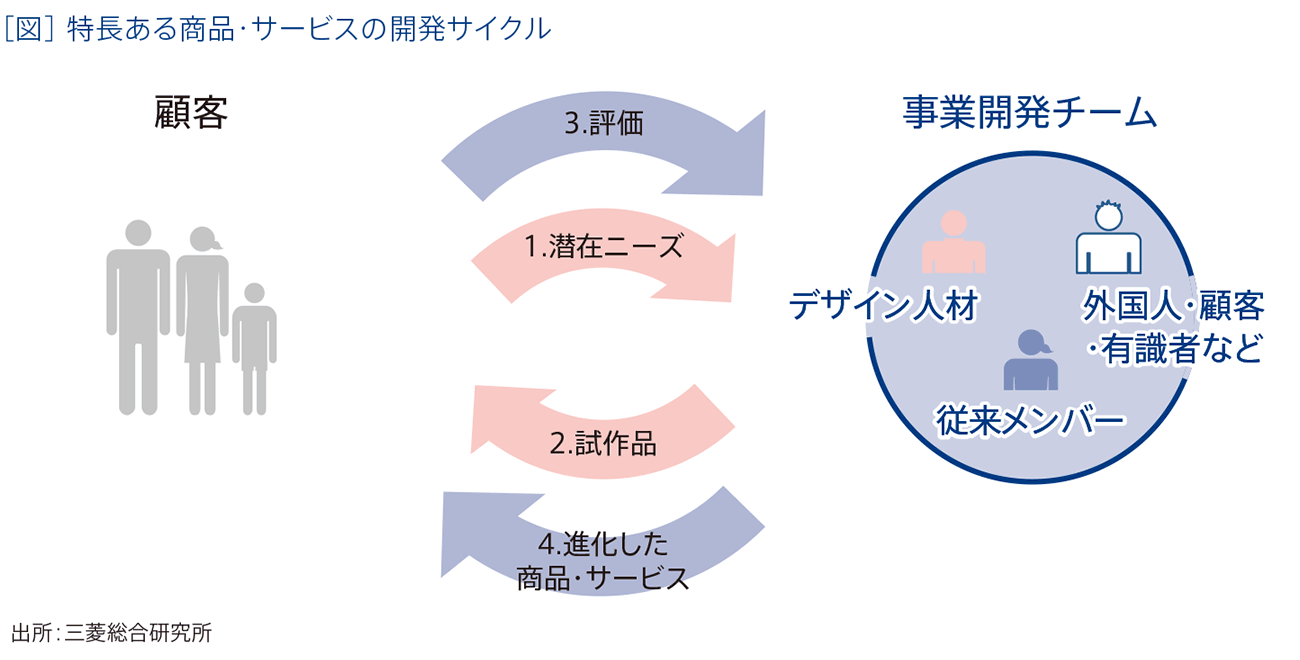 ここで言うデザインは、商品の外見ではなく、コンセプトや使い勝手を含め、商品・サービス全体を形にするという、広い意味だ。 優れた洞察力やコミュニケーションスキルを会得したデザイン人材を、部門や社内外を問わず発掘・起用する。さらに外国人スタッフや顧客、有識者といったメンバーを加えて多様性に満ちた事業開発チームを編成すれば、個性がかち合って化学反応が起き、他社との差別化につながる価値を創出することができる。
