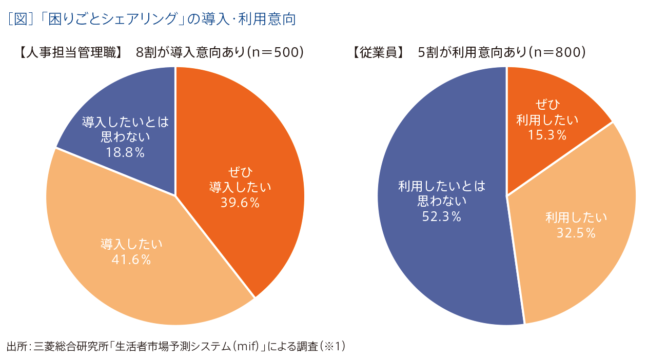 また、一般従業員のうち「利用したい」人は5割弱、情報の提供を依頼された場合に応じるとした人は6割近くいた。これらの結果から、困りごとシェアは、仕組みとして成立する可能性が高いと考えられる。
