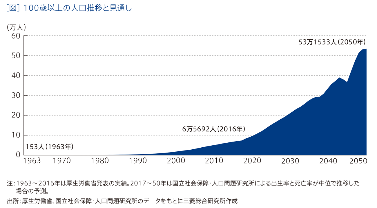 100歳以上の日本人は1963年に153人だったが、2016年には6万5,000人を超えた。国立社会保障・人口問題研究所が人口動態から推計した結果では、2050年には53万人に達する(図)。200人に1人が100歳以上になる計算だ。