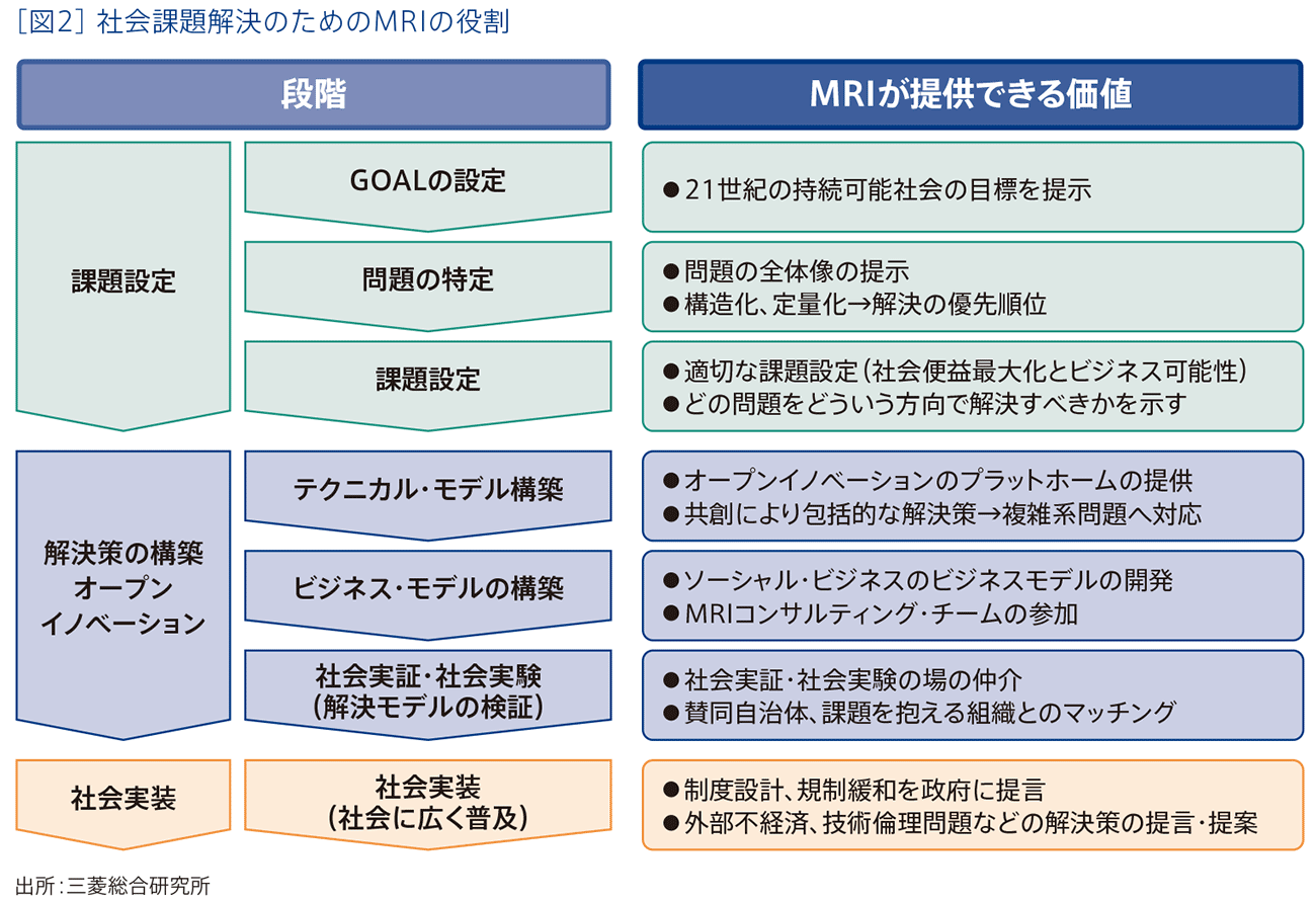 オープンイノベーションは、社会課題の解決策の構築に有効な手法だが、それには、課題設定、解決策の構築、社会実装という三つの段階を通じた総合的な取り組みが求められ、MRIの総合的なリサーチ・分析力が有効に機能する。