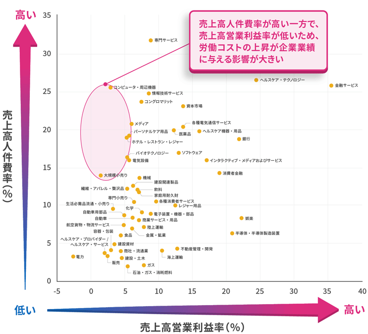 図1は、業種ごとの売上高営業利益率と売上高人件費率を2軸にプロットしたものだ。両指標の水準は業種ごとに大きくばらついているが、とくに注目すべきは左上に位置する「コンピュータ・周辺機器」「ホテル・レストラン・レジャー」「パーソナルケア用品」「大規模小売り」である。低い売上高営業利益率と高い売上高人件費率の組み合わせは、これらの業種における労働集約的なビジネスモデルを示していると考えられる。