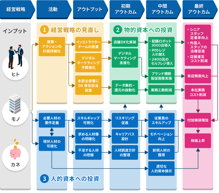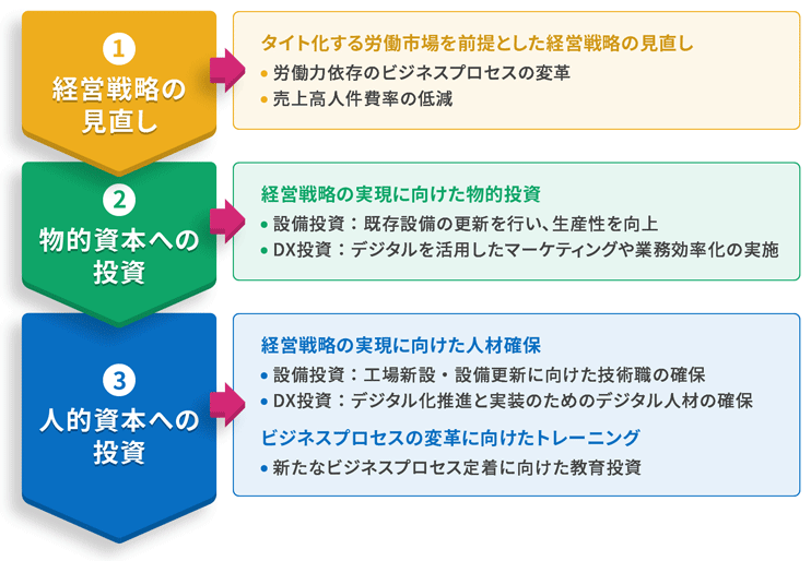 ビジネスプロセスの変革の構想の下で設備やデジタル化などへの投資を実行。従業員の労働を代替する/従業員が効率的に付加価値創出できる仕組みをいかに構築できるかがポイントとなる。