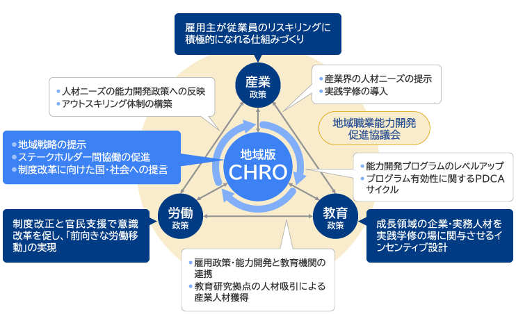 改正法では、地域における職業訓練の司令塔となるべき「地域職業能力開発促進協議会」を、都道府県労働局、都道府県、労使団体、教育訓練実施機関、人材サービス事業者、学識経験者等を構成員として設置・運用することを求めている。こうした、地域のステークホルダーが参集する場を活用し、「地域版人的資本経営」の実現に向けて、「地域戦略の共有と産業戦略との連携」「産業界の人材ニーズの可視化」「可視化された人材ニーズの訓練機関・教育機関との連携」などの促進にイニシアティブを発揮するのが「地域版CHRO」の役割だ。