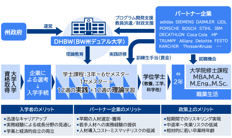 ドイツのDHBWでは、パートナー企業が実習の場を提供するほか、実務人材を教員として大学に派遣している。DHBWの学生は、この実習と学習のデュアルシステムによって、より実践的な能力開発が可能となるほか、パートナー企業は人材の早期の獲得が可能となる。地域の産業と教育の非常に強い連携が構築されている。