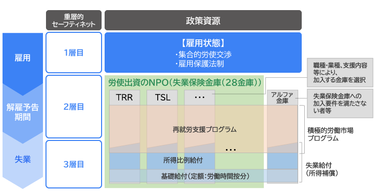 - 労使共同出資のNPO(失業保険金庫)を起点とした労使交渉、再就労支援プログラム、失業給付の一貫支援を実施