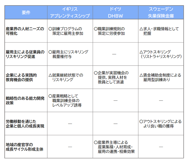 イギリスのアプレンティスシップ・スタンダードでは、雇用主が、自社に真に必要なスキル獲得のための能力開発プログラムを雇用主が選定し、雇用主の裁量で教育プロバイダーを選択できる。また、公的支援受給には時効がある。これらは雇用主にとって、従業員のアプレンティスシップ・スタンダード活用を支援するインセンティブとなっており、就業者のリスキリングの促進につながっている。