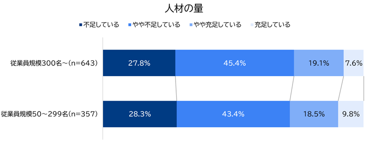 図表1 人材の充足度:いずれの企業規模でも、人材の質・量ともに不足感が強い