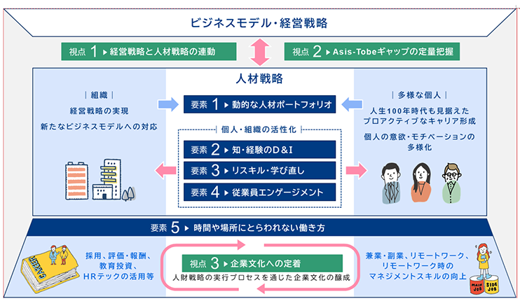 経済産業省が発表した「人材版伊藤レポート1.0」および同「2.0」では、「人材は『管理』の対象ではなく、その価値が伸び縮みする『資本』」として扱うことを要請している。同レポートでは、人材を活かし育てるために求められる経営行動を、3つの視点と5つの要素=「3P・5Fモデル」で整理している(図表1)。