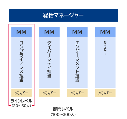 MMは、担当組織のマネジメントに、本来業務として専念する。また、1人がマネジメント全般を担うのではなく、それぞれ専門領域を定義するべきである。先に述べた通り、コンプライアンス対応などマネジャーに求められる業務は多様化しており、それらを1人で対応するのは非効率である。例えば部門単位でのコンプライアンス担当、品質管理担当などを決めるイメージだ。各MMの統率を取るのは、部門長クラスの総括マネジャーになる(図表3)。