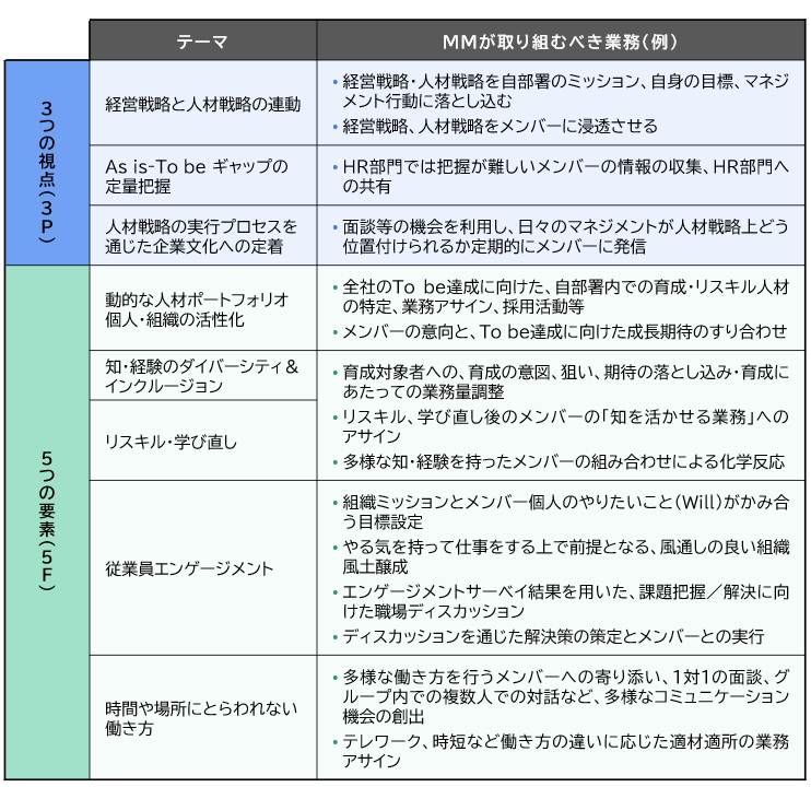MMはこれまでのプレイングマネジャーと業務やマインドセットがまったく異なるため、目標設定や評価制度設計、研修を通した意識変革が求められる。また、全社的にも、MMを重要なタレントとして、人材ポートフォリオ上に位置付け、スキルと人数を設定し、育成施策を整備することが必要である。