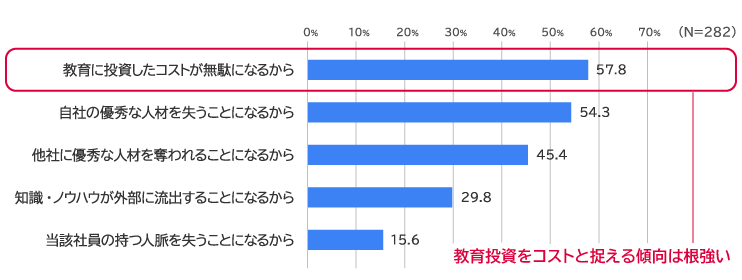 他方、図表1の設問で「強く問題視している」「やや問題視している」とした回答者に、その理由を尋ねた結果が図表2である。全体として最も選択率が高かったのが、「教育に投資したコストが無駄になるから」であり、回答者の6割弱がこれを理由として挙げている。