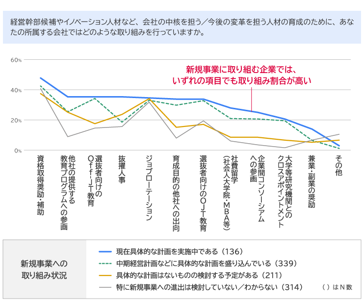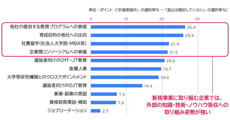 このうち「現在具体的な計画を実施中である」とした回答者と、「特に新規事業への進出はしていない/わからない」とした回答者との取り組み状況を比較した(差分を取り出した)のが、図表2である。最も乖離(かいり)が大きいのは「他社の提供する教育プログラムへの参画」で、以降「育成目的の他社への出向」「社費留学」「企業間コンソーシアムへの参画」と、社外での学びに該当する項目が続く。新規事業に取り組む企業ほど、選抜者向けの教育の意味合い以上に、外部の知識・技術・ノウハウ吸収への取り組み姿勢が強いと推察できる。