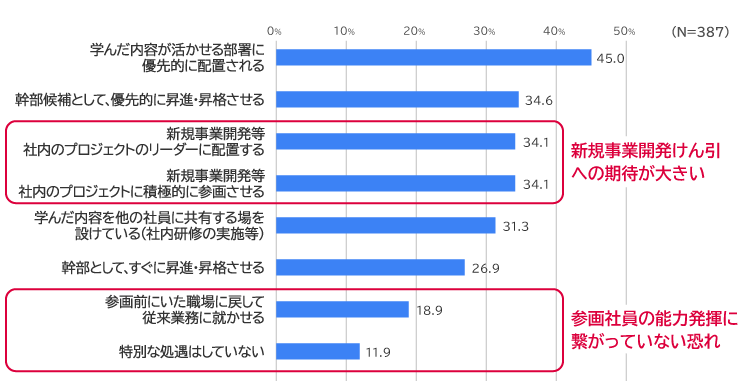 他方、「参画前にいた職場に戻して従来業務に就かせる」「特別な処遇はしていない」が合わせて3割ほどに及ぶ点が注目される。これら教育プログラムは、投資規模としては大きいはずであるが、そこに参画した社員が得た能力・知見を十分に発揮できていない可能性がある。