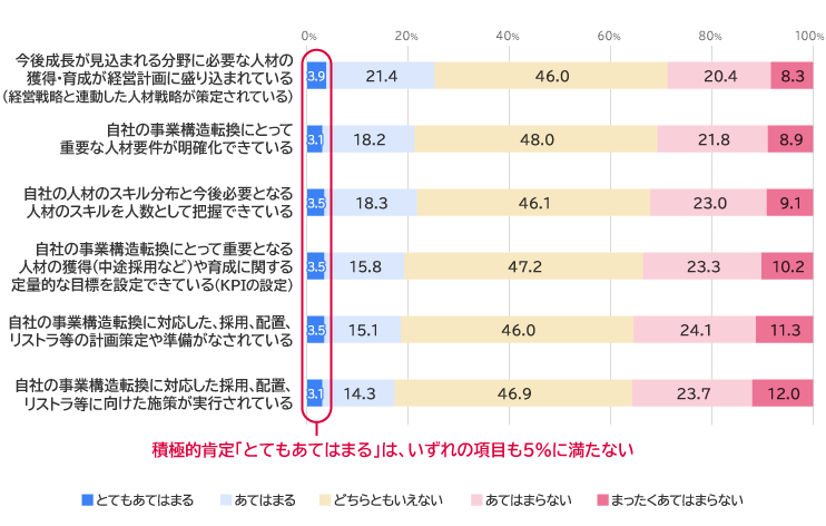 一方でこうしたスキル転換、および成長領域への人材シフトは、産業・企業をまたぐ場合はもとより、各企業内でも十分進んでいるとは言えない状況である。図表1は、産業構造変化に際した人材戦略・人材マネジメントの対応状況についてのアンケート結果である。スキル転換に向けて教育訓練を施す以前に、「人材要件が明確化できている」「今後必要となる人材のスキルを人数として把握できている」「採用や育成に関する定量的な目標を設定できている」などいずれの項目も、否定的回答が肯定的回答を上回っている。また、いずれの項目も積極的肯定「とてもあてはまる」の割合は5%に満たない。