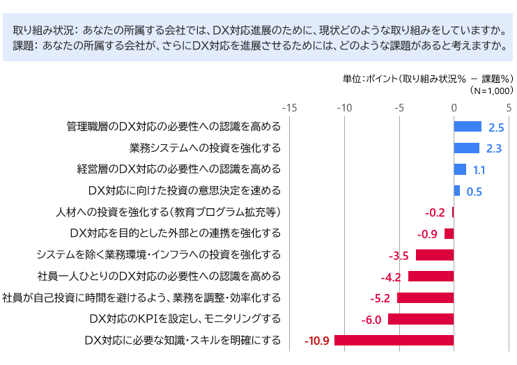 これはDX対応の必要性こそ浸透しているものの、「具体的にどのような知識・スキルを獲得すれば良いか」「その企業におけるDXとは何か」を企業自体が明確にできていない、または社員に明示できていないことの表れである。