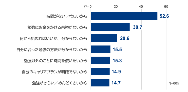 日本の社会人がリカレント教育に取り組んでいない理由として、多くの調査で上位を占めるのは、「時間的余裕のなさ」と「金銭的余裕のなさ」である。しかし「何を学ぶべきかわからない」という回答がそれに次いで多いことは、注目に値するだろう。例えば、厚生労働省の調査では、「自己啓発を行う上での問題点」として、多忙・費用負担の次に「どのようなコースが自分の目指すキャリアに適切なのかわからない」「自分の目指すべきキャリアがわからない」という回答が挙げられている※7(図1)。また、マイナビの調査でも、「学び直しをしない理由」として、多忙・費用負担のあとに「何から始めればいいか、分からないから」という回答が続いている※8(図2)。