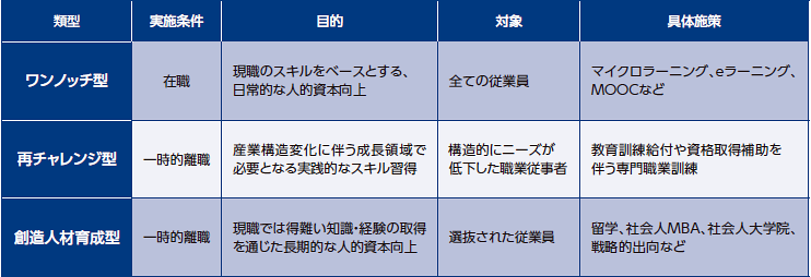 そこで最後に、上述のキャリアシフトの類型別に、リカレント教育の実施を通して社員のキャリアシフトを支援している企業の例をいくつか紹介する。