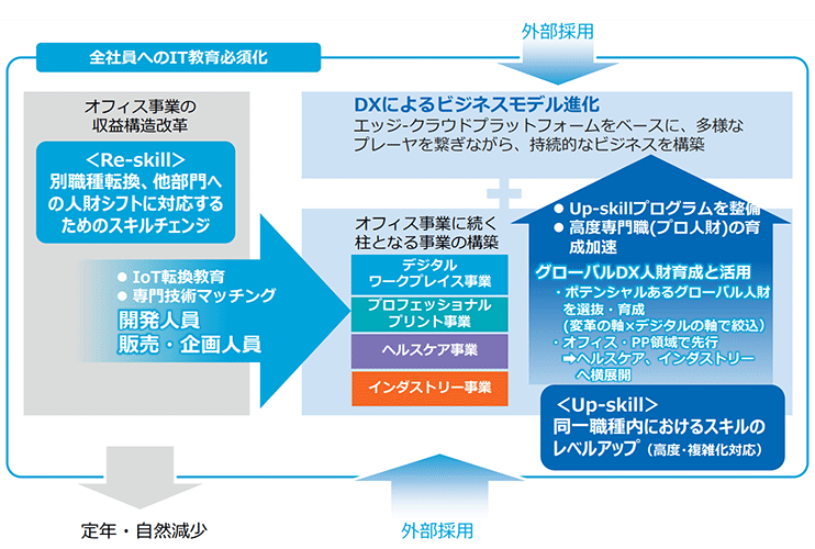 同社では、コピー機等のプロダクツ販売から、DXによる高収益ビジネスへの転換を目指し、DXを推進する人材の確保・育成を行っている※19※21。特に、開発人員や販売・企画人員に対しては、「Re-skill」と呼ばれる研修体系においてIoT転換教育や専門技術のマッチングを行い、デジタルワークプレイス事業やプロフェッショナルプリント事業、ヘルスケア事業、インダストリー事業など、従来のオフィス事業に続く柱となる事業で活躍する人材へと、シフトを促している※22(図5)。