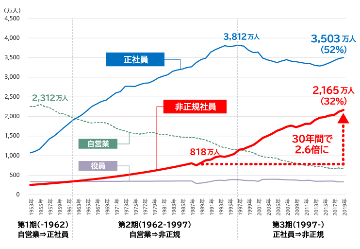 確かに、今から30年以上前の1985年には、非正規社員といえば世帯主の夫の収入をベースに、妻がパートタイマーなどで補助的に支える図式が一般的であり、非正規社員の数も雇用者全体の16.4%にすぎなかった。しかし、2020年の時点で非正規社員の世帯主は全国で400万人を超えている(うち男性314万人、女性118万人)。しかも、男性に限れば、非正規社員全体の約半数が世帯主である。非正規社員の数は1990年代後半に自営業者を追い抜き、その後も増加を続け、30年間で2.6倍になっている(図1)。このペースで増え続ければ、非正規の数は今後20年もたたないうちに正社員数を上回る可能性すらある。
