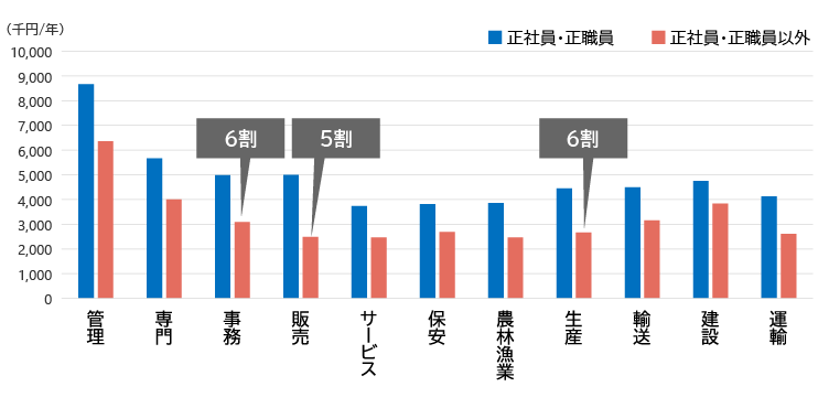 非正規社員の数を職種別に見てみよう。厚生労働省の「労働力調査」によるとサービス職(446万人)が首位で、事務職(402万人)が2位となっており、販売職、運輸職、生産職、専門技術職が続く。同省の「賃金構造基本統計調査」によると、非正規社員(「正社員・正職員以外」)の年収額は正社員(「正社員・正職員」)に比べてかなり低い水準にある。例えば事務職や生産職の場合は正社員の6割程度(それぞれ300万円強、300万円弱)、販売職の場合は正社員の5割程度(約250万円)となっている(図2)。
