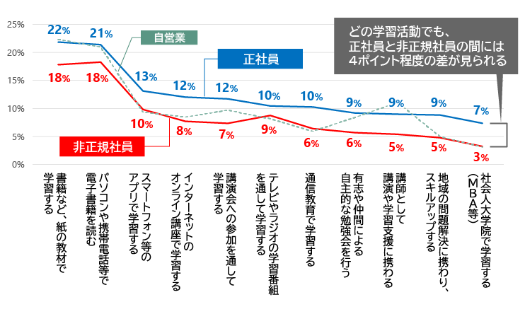 このような状態が続くと、社会全体で見た時に就業者の人的資本の総量は高まらず、日本の労働生産性は低い水準にとどまってしまう。入社から定年までの長期的な観点に立った人材育成の仕組みと、日々の業務遂行を通じたOJTによる教育機会のある正社員とは異なり、非正規社員はなかなか企業による能力開発支援の恩恵を受けられない。さりとて自己学習も活発に行っているわけでもなく(図4)、人的資本形成メカニズムは機能していないと言わざるを得ない。この問題を解決するインセンティブを企業単位では持ちづらいため、解決は社会全体で図るしかないと思われる。