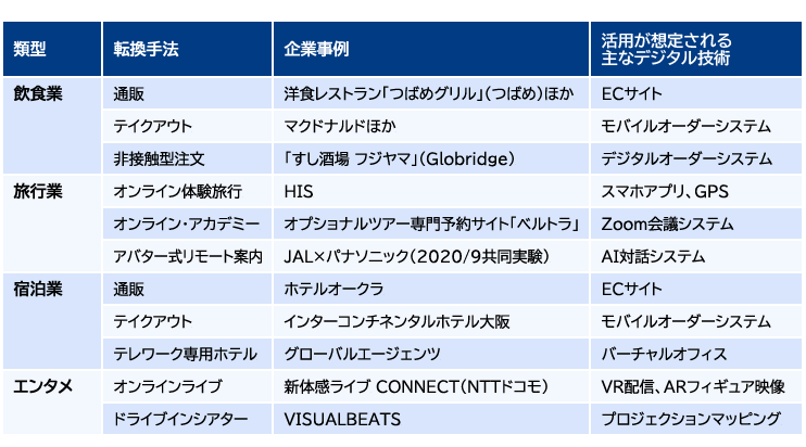 冒頭で概観した通り、数百万人もの不足が見込まれる専門・技術職の育成は、日本社会における喫緊の課題の1つとなっている。専門・技術職の中で特に産業構造の転換の大きな鍵を握るのは、「デジタル人材」であろう。今般のコロナ禍において、対面によるサービス提供を基本とする飲食、宿泊、旅行業、エンタメなどの「生活娯楽関連サービス」の企業の中には、事業を継続する必要性から、いち早く非接触、遠隔に対応したビジネスモデルに積極的に転換を図ろうとしている事例が見られ、ビジネスモデル転換にデジタル技術を活用した取り組みが数多く含まれている(表1)。もっとも、DXは幅広い業界で行われており、デジタル人材を求める企業の業界は生活娯楽関連サービスの企業に限らない。技術系(IT・通信)の職種の場合、求職者一人当たり8件以上の求人※7がある。こうした求人倍率の高さが、多様な業種の企業においてデジタル人材が求められていることを裏付けている。