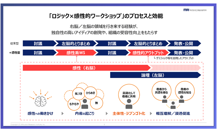 橋本:MRIのコンサルティングでは、調査フェーズや提言フェーズの合間で、社内の声を集める目的などで感性的手法を取り入れています。まずは左脳を使うワークショップをMRIが行い、そのあと右脳を使うワークショップを外部パートナーに担当いただいています。